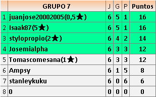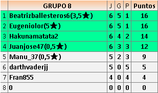 Deja un comentarioEn está página se irán publicando los resultados de las diferentes partidas, siendo ambos jugadores responsables de subirlos o de comprobar que ya hayan sido publicados insertando un COMENTARIO en la parte inferior de la pantalla (opción “Deja tu comentario”), indicando el nombre de los dos jugadores y los puntos obtenidos en la partida.