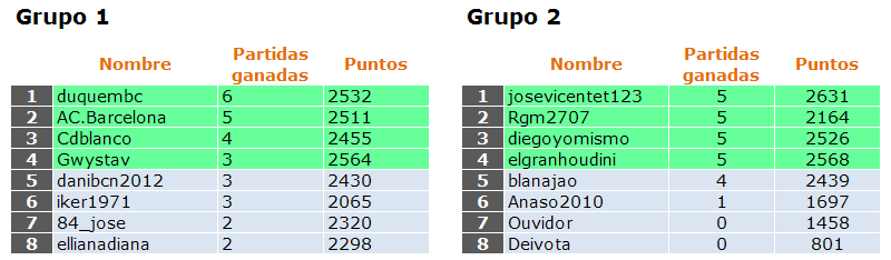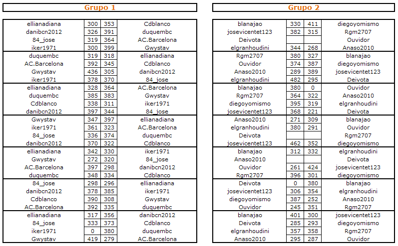Deja un comentarioEn está página se irán indicando los resultados de las diferentes partidas. Lo único que tienes que hacer es insertar un comentario en la parte inferior de la pantalla (“Deja tu comentario”) indicando el nombre de los dos usuarios y los puntos obtenidos por ambos en la partida. El vencedor de cada partida será el encargado de comunicar el resultado en este apartado.