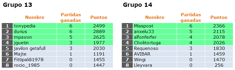 Deja un comentarioEn está página se irán indicando los resultados de las diferentes partidas. Lo único que tienes que hacer es insertar un comentario en la parte inferior de la pantalla (“Deja tu comentario”) indicando el nombre de los dos usuarios y los puntos obtenidos por ambos en la partida. El vencedor de cada partida será el encargado de comunicar el resultado en este apartado.