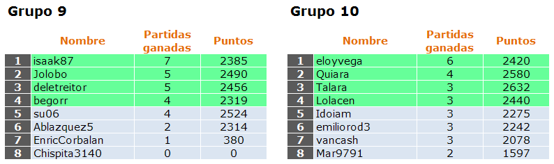 Deja un comentarioEn está página se irán indicando los resultados de las diferentes partidas. Lo único que tienes que hacer es insertar un comentario en la parte inferior de la pantalla (“Deja tu comentario”) indicando el nombre de los dos usuarios y los puntos obtenidos por ambos en la partida. El vencedor de cada partida será el encargado de comunicar el resultado en este apartado.