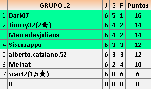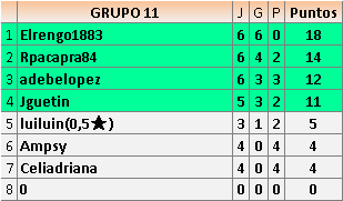 Deja un comentarioEn está página se irán publicando los resultados de las diferentes partidas, siendo ambos jugadores responsables de subirlos o de comprobar que ya hayan sido publicados insertando un COMENTARIO en la parte inferior de la pantalla (opción “Deja tu comentario”), indicando el nombre de los dos jugadores y los puntos obtenidos en la partida.