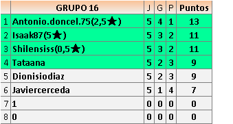Deja un comentarioEn está página se irán publicando los resultados de las diferentes partidas, siendo ambos jugadores responsables de subirlos o de comprobar que ya hayan sido publicados insertando un COMENTARIO en la parte inferior de la pantalla (opción “Deja tu comentario”), indicando el nombre de los dos jugadores y los puntos obtenidos en la partida.