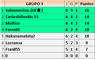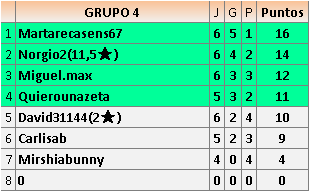 Deja un comentarioEn está página se irán publicando los resultados de las diferentes partidas, siendo ambos jugadores responsables de subirlos o de comprobar que ya hayan sido publicados insertando un COMENTARIO en la parte inferior de la pantalla (opción “Deja tu comentario”), indicando el nombre de los dos jugadores y los puntos obtenidos en la partida.