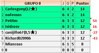 Deja un comentarioEn está página se irán publicando los resultados de las diferentes partidas, siendo ambos jugadores responsables de subirlos o de comprobar que ya hayan sido publicados insertando un COMENTARIO en la parte inferior de la pantalla (opción “Deja tu comentario”), indicando el nombre de los dos jugadores y los puntos obtenidos en la partida.