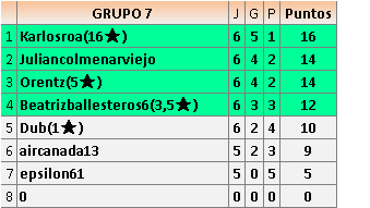 Deja un comentarioEn está página se irán publicando los resultados de las diferentes partidas, siendo ambos jugadores responsables de subirlos o de comprobar que ya hayan sido publicados insertando un COMENTARIO en la parte inferior de la pantalla (opción “Deja tu comentario”), indicando el nombre de los dos jugadores y los puntos obtenidos en la partida.