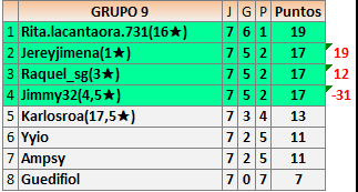 Deja un comentarioEn está página se irán publicando los resultados de las diferentes partidas, siendo ambos jugadores responsables de subirlos o de comprobar que ya hayan sido publicados insertando un COMENTARIO en la parte inferior de la pantalla (opción “Deja tu comentario”), indicando el nombre de los dos jugadores y los puntos obtenidos en la partida.
