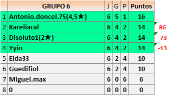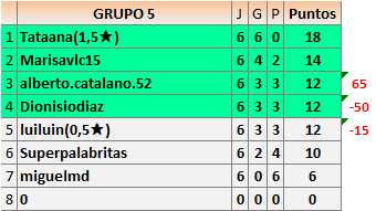 Deja un comentarioEn está página se irán publicando los resultados de las diferentes partidas, siendo ambos jugadores responsables de subirlos o de comprobar que ya hayan sido publicados insertando un COMENTARIO en la parte inferior de la pantalla (opción “Deja tu comentario”), indicando el nombre de los dos jugadores y los puntos obtenidos en la partida.