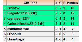 Deja un comentarioEn está página se irán publicando los resultados de las diferentes partidas, siendo ambos jugadores responsables de subirlos o de comprobar que ya hayan sido publicados insertando un COMENTARIO en la parte inferior de la pantalla (opción “Deja tu comentario”), indicando el nombre de los dos jugadores y los puntos obtenidos en la partida.