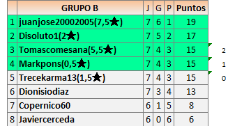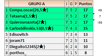 Deja un comentarioEn está página se irán publicando los resultados de las diferentes partidas, siendo ambos jugadores responsables de subirlos o de comprobar que ya hayan sido publicados insertando un COMENTARIO en la parte inferior de la pantalla (opción “Deja tu comentario”), indicando el nombre de los dos jugadores y los puntos obtenidos en la partida.