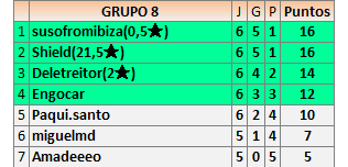 Deja un comentarioEn está página se irán publicando los resultados de las diferentes partidas, siendo ambos jugadores responsables de subirlos o de comprobar que ya hayan sido publicados insertando un COMENTARIO en la parte inferior de la pantalla (opción “Deja tu comentario”), indicando el nombre de los dos jugadores y los puntos obtenidos en la partida.