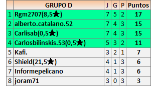 Deja un comentarioEn está página se irán publicando los resultados de las diferentes partidas, siendo ambos jugadores responsables de subirlos o de comprobar que ya hayan sido publicados insertando un COMENTARIO en la parte inferior de la pantalla (opción “Deja tu comentario”), indicando el nombre de los dos jugadores y los puntos obtenidos en la partida.
