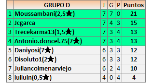 Deja un comentarioEn está página se irán publicando los resultados de las diferentes partidas, siendo ambos jugadores responsables de subirlos o de comprobar que ya hayan sido publicados insertando un COMENTARIO en la parte inferior de la pantalla (opción “Deja tu comentario”), indicando el nombre de los dos jugadores y los puntos obtenidos en la partida.