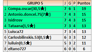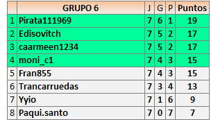 Deja un comentarioEn está página se irán publicando los resultados de las diferentes partidas, siendo ambos jugadores responsables de subirlos o de comprobar que ya hayan sido publicados insertando un COMENTARIO en la parte inferior de la pantalla (opción “Deja tu comentario”), indicando el nombre de los dos jugadores y los puntos obtenidos en la partida.