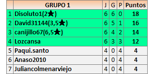 Deja un comentarioEn está página se irán publicando los resultados de las diferentes partidas, siendo ambos jugadores responsables de subirlos o de comprobar que ya hayan sido publicados insertando un COMENTARIO en la parte inferior de la pantalla (opción “Deja tu comentario”), indicando el nombre de los dos jugadores y los puntos obtenidos en la partida.