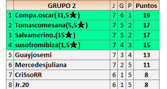 Deja un comentarioEn está página se irán publicando los resultados de las diferentes partidas, siendo ambos jugadores responsables de subirlos o de comprobar que ya hayan sido publicados insertando un COMENTARIO en la parte inferior de la pantalla (opción “Deja tu comentario”), indicando el nombre de los dos jugadores y los puntos obtenidos en la partida.