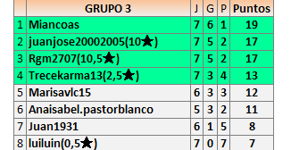 Deja un comentarioEn está página se irán publicando los resultados de las diferentes partidas, siendo ambos jugadores responsables de subirlos o de comprobar que ya hayan sido publicados insertando un COMENTARIO en la parte inferior de la pantalla (opción “Deja tu comentario”), indicando el nombre de los dos jugadores y los puntos obtenidos en la partida.