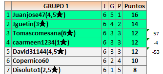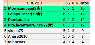 Deja un comentarioEn está página se irán publicando los resultados de las diferentes partidas, siendo ambos jugadores responsables de subirlos o de comprobar que ya hayan sido publicados insertando un COMENTARIO en la parte inferior de la pantalla (opción “Deja tu comentario”), indicando el nombre de los dos jugadores y los puntos obtenidos en la partida.