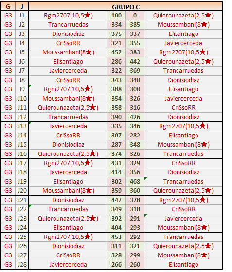 Deja un comentarioEn está página se irán publicando los resultados de las diferentes partidas, siendo ambos jugadores responsables de subirlos o de comprobar que ya hayan sido publicados insertando un COMENTARIO en la parte inferior de la pantalla (opción “Deja tu comentario”), indicando el nombre de los dos jugadores y los puntos obtenidos en la partida.