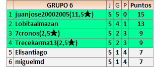 Deja un comentarioEn está página se irán publicando los resultados de las diferentes partidas, siendo ambos jugadores responsables de subirlos o de comprobar que ya hayan sido publicados insertando un COMENTARIO en la parte inferior de la pantalla (opción “Deja tu comentario”), indicando el nombre de los dos jugadores y los puntos obtenidos en la partida.