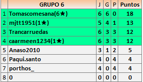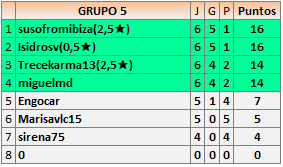 Deja un comentarioEn está página se irán publicando los resultados de las diferentes partidas, siendo ambos jugadores responsables de subirlos o de comprobar que ya hayan sido publicados insertando un COMENTARIO en la parte inferior de la pantalla (opción “Deja tu comentario”), indicando el nombre de los dos jugadores y los puntos obtenidos en la partida.