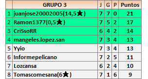 Deja un comentarioEn está página se irán publicando los resultados de las diferentes partidas, siendo ambos jugadores responsables de subirlos o de comprobar que ya hayan sido publicados insertando un COMENTARIO en la parte inferior de la pantalla (opción “Deja tu comentario”), indicando el nombre de los dos jugadores y los puntos obtenidos en la partida.