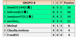 Deja un comentarioEn está página se irán publicando los resultados de las diferentes partidas, siendo ambos jugadores responsables de subirlos o de comprobar que ya hayan sido publicados insertando un COMENTARIO en la parte inferior de la pantalla (opción “Deja tu comentario”), indicando el nombre de los dos jugadores y los puntos obtenidos en la partida.