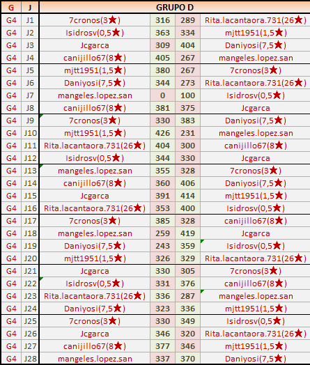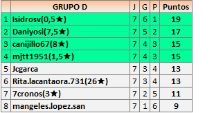 Deja un comentarioEn está página se irán publicando los resultados de las diferentes partidas, siendo ambos jugadores responsables de subirlos o de comprobar que ya hayan sido publicados insertando un COMENTARIO en la parte inferior de la pantalla (opción “Deja tu comentario”), indicando el nombre de los dos jugadores y los puntos obtenidos en la partida.