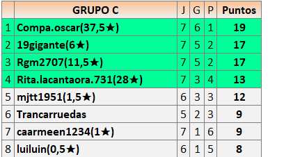 Deja un comentarioEn está página se irán publicando los resultados de las diferentes partidas, siendo ambos jugadores responsables de subirlos o de comprobar que ya hayan sido publicados insertando un COMENTARIO en la parte inferior de la pantalla (opción “Deja tu comentario”), indicando el nombre de los dos jugadores y los puntos obtenidos en la partida.