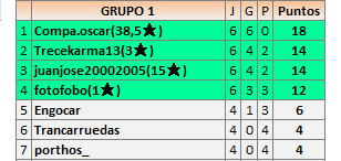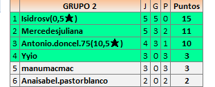 Deja un comentarioEn está página se irán publicando los resultados de las diferentes partidas, siendo ambos jugadores responsables de subirlos o de comprobar que ya hayan sido publicados insertando un COMENTARIO en la parte inferior de la pantalla (opción “Deja tu comentario”), indicando el nombre de los dos jugadores y los puntos obtenidos en la partida.