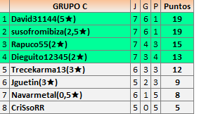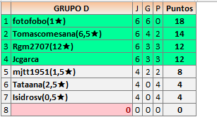 Deja un comentarioEn está página se irán publicando los resultados de las diferentes partidas, siendo ambos jugadores responsables de subirlos o de comprobar que ya hayan sido publicados insertando un COMENTARIO en la parte inferior de la pantalla (opción “Deja tu comentario”), indicando el nombre de los dos jugadores y los puntos obtenidos en la partida.