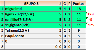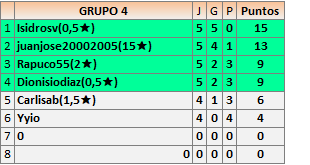Deja un comentarioEn está página se irán publicando los resultados de las diferentes partidas, siendo ambos jugadores responsables de subirlos o de comprobar que ya hayan sido publicados insertando un COMENTARIO en la parte inferior de la pantalla (opción “Deja tu comentario”), indicando el nombre de los dos jugadores y los puntos obtenidos en la partida.