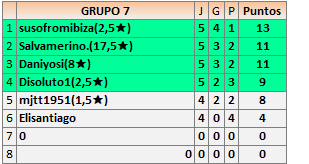 Deja un comentarioEn está página se irán publicando los resultados de las diferentes partidas, siendo ambos jugadores responsables de subirlos o de comprobar que ya hayan sido publicados insertando un COMENTARIO en la parte inferior de la pantalla (opción “Deja tu comentario”), indicando el nombre de los dos jugadores y los puntos obtenidos en la partida.