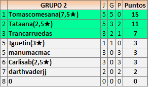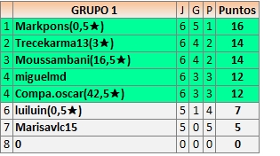 Deja un comentarioEn está página se irán publicando los resultados de las diferentes partidas, siendo ambos jugadores responsables de subirlos o de comprobar que ya hayan sido publicados insertando un COMENTARIO en la parte inferior de la pantalla (opción “Deja tu comentario”), indicando el nombre de los dos jugadores y los puntos obtenidos en la partida.
