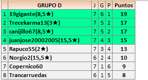 Deja un comentarioEn está página se irán publicando los resultados de las diferentes partidas, siendo ambos jugadores responsables de subirlos o de comprobar que ya hayan sido publicados insertando un COMENTARIO en la parte inferior de la pantalla (opción “Deja tu comentario”), indicando el nombre de los dos jugadores y los puntos obtenidos en la partida.