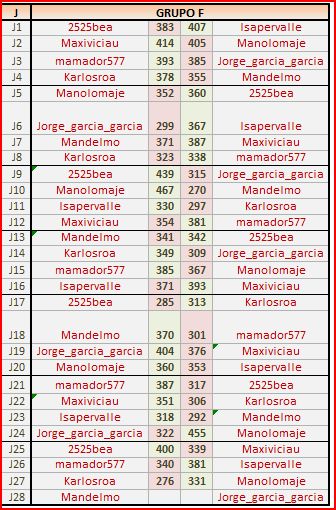 Deja un comentarioEn está página se irán publicando los resultados de las diferentes partidas, siendo ambos jugadores los responsables de subirlos, o comprobando que ya hayan sido subidos, insertando un COMENTARIO en la parte inferior de la pantalla (opción «Deja tu comentario»), indicando el nombre de los dos jugadores y los puntos obtenidos en la partida.