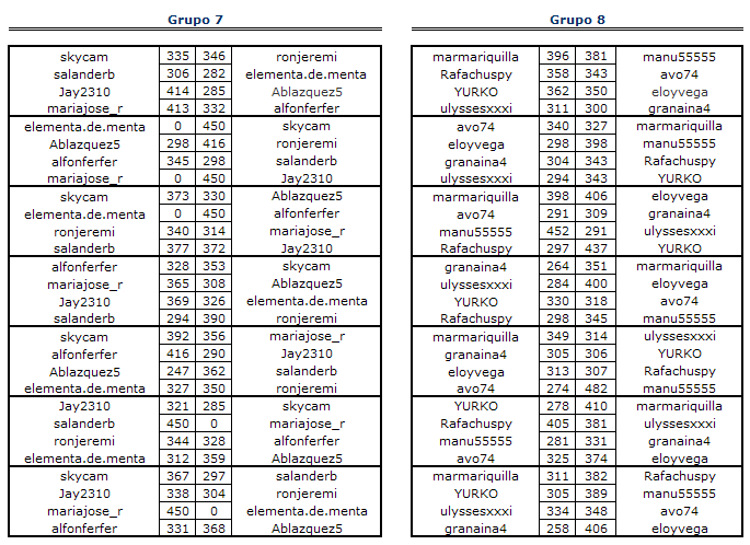 Deja un comentarioEn está página se irán indicando los resultados de las diferentes partidas. Lo único que tienes que hacer es insertar un comentario en la parte inferior de la pantalla (“Deja tu comentario”) indicando el nombre de los dos usuarios y los puntos obtenidos por ambos en la partida. El vencedor de cada partida será el encargado de comunicar el resultado en este apartado.