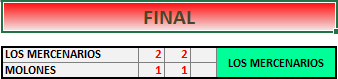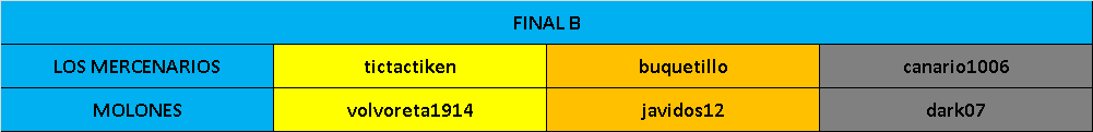 Quisiera felicitar al equipo Los Mercenarios por su gran y merecida victoria en la final que hemos jugado con ellos, han demostrado porque son los campeones, mucha deportividad, juego limpio y maximo nivel, solo deciros enhorabuena.