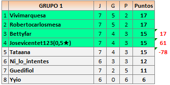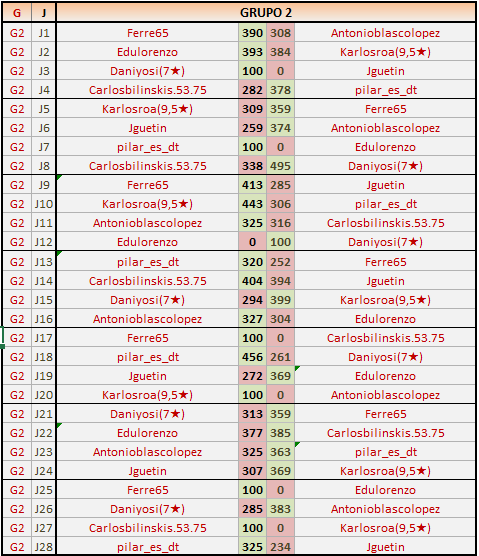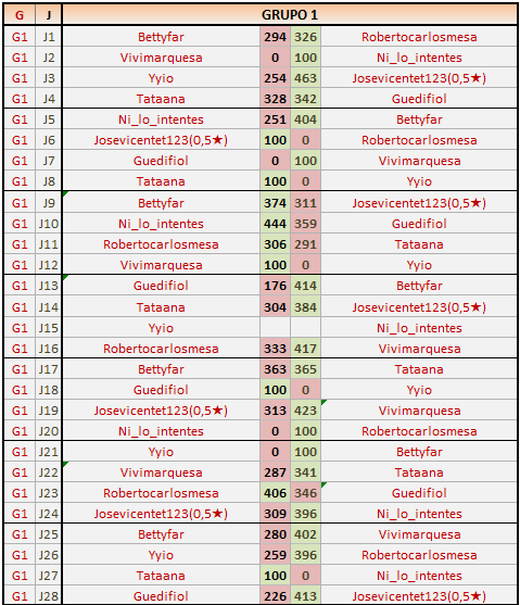 Deja un comentarioEn está página se irán publicando los resultados de las diferentes partidas, siendo ambos jugadores responsables de subirlos o de comprobar que ya hayan sido publicados insertando un COMENTARIO en la parte inferior de la pantalla (opción «Deja tu comentario»), indicando el nombre de los dos jugadores y los puntos obtenidos en la partida.