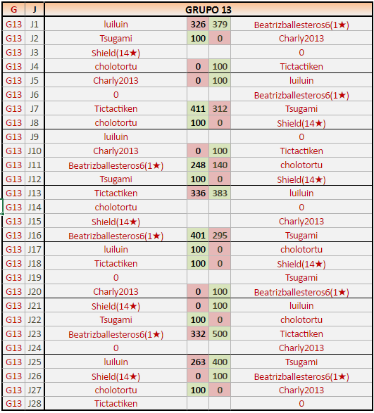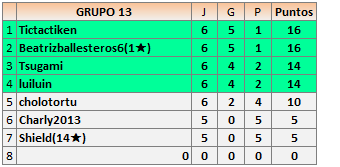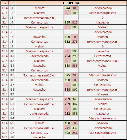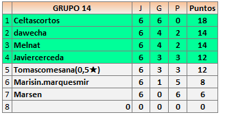 Deja un comentarioEn está página se irán publicando los resultados de las diferentes partidas, siendo ambos jugadores responsables de subirlos o de comprobar que ya hayan sido publicados insertando un COMENTARIO en la parte inferior de la pantalla (opción «Deja tu comentario»), indicando el nombre de los dos jugadores y los puntos obtenidos en la partida.