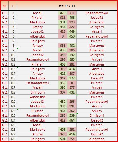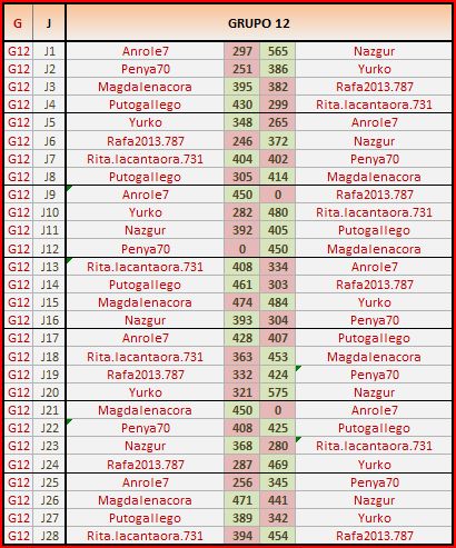 Deja un comentarioEn está página se irán publicando los resultados de las diferentes partidas, siendo ambos jugadores los responsables de subirlos, o comprobando que ya hayan sido subidos, insertando un COMENTARIO en la parte inferior de la pantalla (opción «Deja tu comentario«), indicando el nombre de los dos jugadores y los puntos obtenidos en la partida.