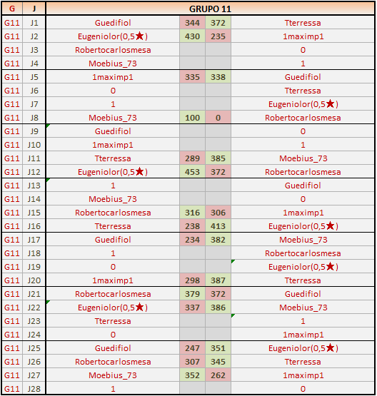 Deja un comentarioEn está página se irán publicando los resultados de las diferentes partidas, siendo ambos jugadores los responsables de subirlos, o comprobando que ya hayan sido subidos, insertando un COMENTARIO en la parte inferior de la pantalla (opción “Deja tu comentario”), indicando el nombre de los dos jugadores y los puntos obtenidos en la partida.
