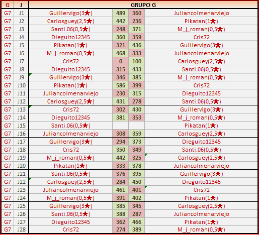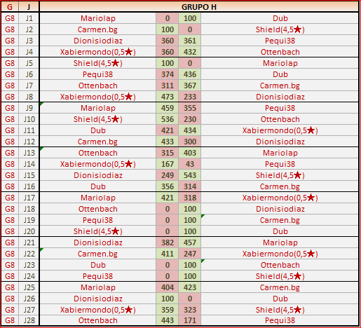 Deja un comentarioEn está página se irán publicando los resultados de las diferentes partidas, siendo ambos jugadores los responsables de subirlos, o comprobando que ya hayan sido subidos, insertando un COMENTARIO en la parte inferior de la pantalla (opción «Deja tu comentario«), indicando el nombre de los dos jugadores y los puntos obtenidos en la partida.