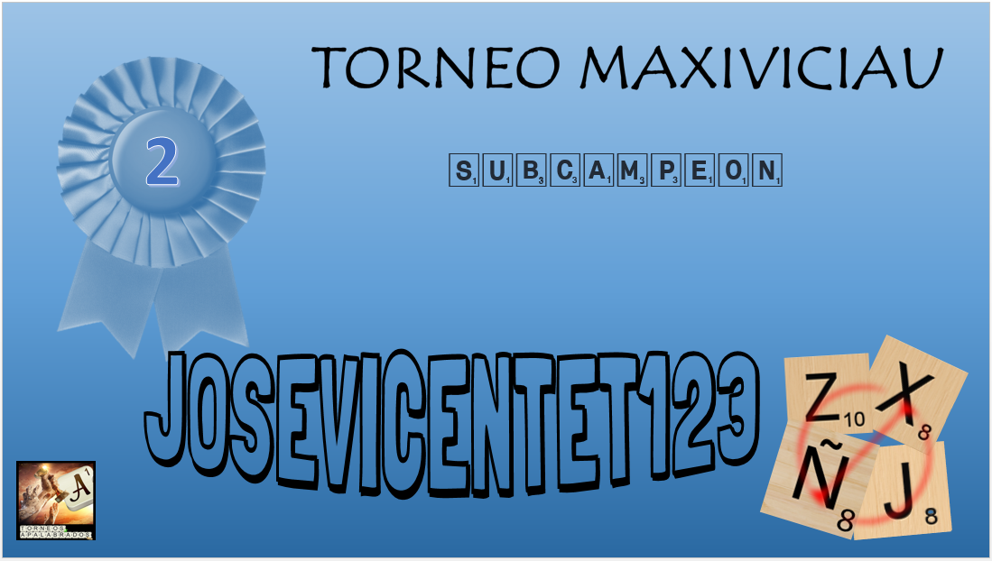 Tanto al subcampeón Josevicentet, al que cada vez me resulta más difícil ganarle, como al gran maestro Salvador (…si como me comentaste después de la 2ª partida, “te hice echar humo por la cabeza”, no veas como estaba la mía cuando estaba 30 puntos abajo y en posesión de la X, Ñ y Z… y encima convencido de que ganabas a Jose y a Loli…). Y también felicitar a Loli… el gesto que tuviste de pedirme disculpas por no “darme nada de juego” en la segunda partida, realmente me conmovió… y creo que demuestra tu gran talla no solo como jugadora sino también como persona… Y no quiero olvidarme del quinto finalista: Diego… aunque no comparto en absoluto sus desafortunados comentarios (y en particular los referidos a Jaime, una de las personas q más admiro de esta web), creo que, en el fondo, es un gran tipo, además de magnífico jugador… y pediría al “comité de Apelación” de la web que reconsideréis la dura sanción que le habéis impuesto…