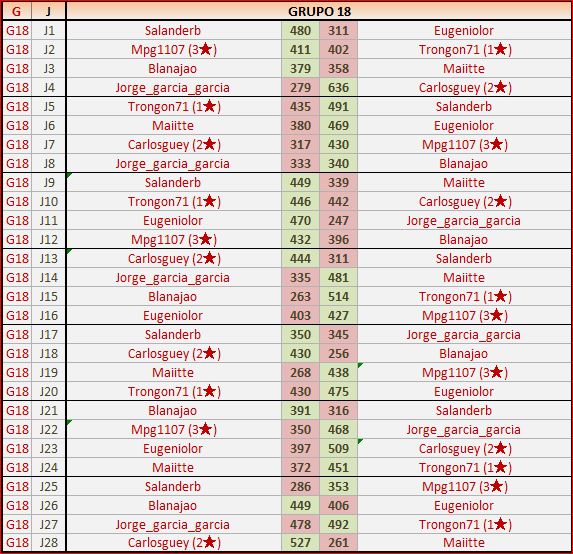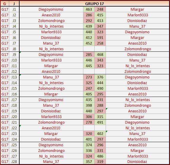 Deja un comentarioEn está página se irán publicando los resultados de las diferentes partidas, siendo ambos jugadores los responsables de subirlos, o comprobando que ya hayan sido subidos, insertando un COMENTARIO en la parte inferior de la pantalla (opción «Deja tu comentario«), indicando el nombre de los dos jugadores y los puntos obtenidos en la partida.
