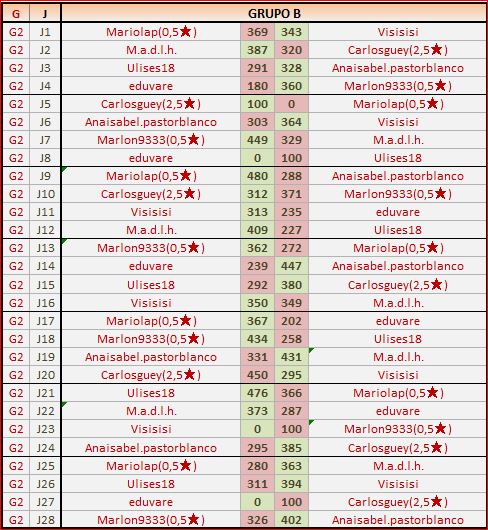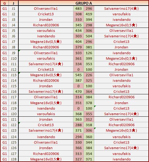 Deja un comentarioEn está página se irán publicando los resultados de las diferentes partidas, siendo ambos jugadores los responsables de subirlos, o comprobando que ya hayan sido subidos, insertando un COMENTARIO en la parte inferior de la pantalla (opción “Deja tu comentario“), indicando el nombre de los dos jugadores y los puntos obtenidos en la partida.
