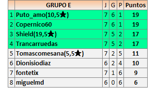 Deja un comentarioEn está página se irán publicando los resultados de las diferentes partidas, siendo ambos jugadores responsables de subirlos o de comprobar que ya hayan sido publicados insertando un COMENTARIO en la parte inferior de la pantalla (opción “Deja tu comentario”), indicando el nombre de los dos jugadores y los puntos obtenidos en la partida.