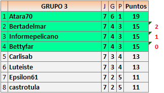Deja un comentarioEn está página se irán publicando los resultados de las diferentes partidas, siendo ambos jugadores responsables de subirlos o de comprobar que ya hayan sido publicados insertando un COMENTARIO en la parte inferior de la pantalla (opción “Deja tu comentario”), indicando el nombre de los dos jugadores y los puntos obtenidos en la partida.