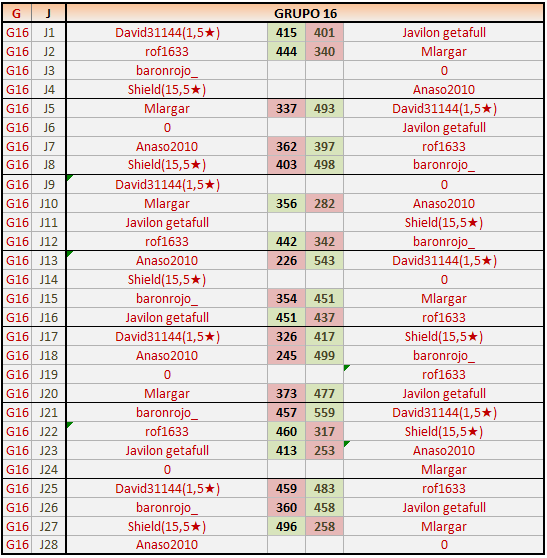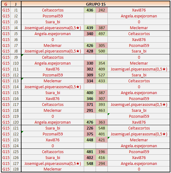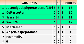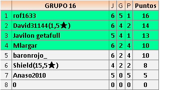 Deja un comentarioEn está página se irán publicando los resultados de las diferentes partidas, siendo ambos jugadores responsables de subirlos o de comprobar que ya hayan sido publicados insertando un COMENTARIO en la parte inferior de la pantalla (opción “Deja tu comentario”), indicando el nombre de los dos jugadores y los puntos obtenidos en la partida.