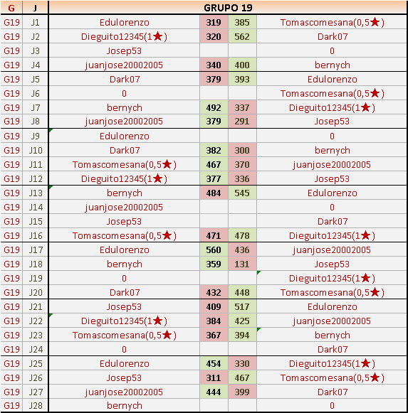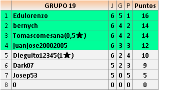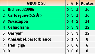 Deja un comentarioEn está página se irán publicando los resultados de las diferentes partidas, siendo ambos jugadores responsables de subirlos o de comprobar que ya hayan sido publicados insertando un COMENTARIO en la parte inferior de la pantalla (opción “Deja tu comentario”), indicando el nombre de los dos jugadores y los puntos obtenidos en la partida.