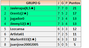 Deja un comentarioEn está página se irán publicando los resultados de las diferentes partidas, siendo ambos jugadores responsables de subirlos o de comprobar que ya hayan sido publicados insertando un COMENTARIO en la parte inferior de la pantalla (opción “Deja tu comentario”), indicando el nombre de los dos jugadores y los puntos obtenidos en la partida.